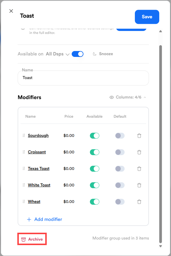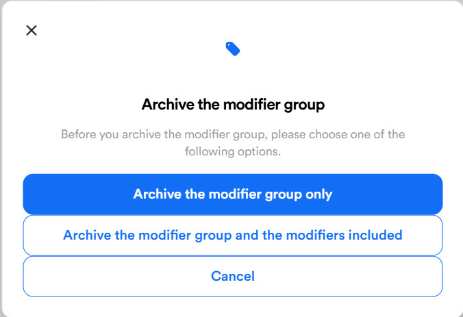 Note: Deleting this group will remove it from all items it’s associated with. - Select Archive to delete the modifier group.