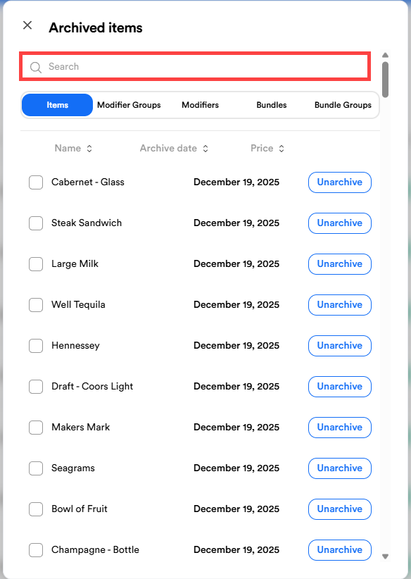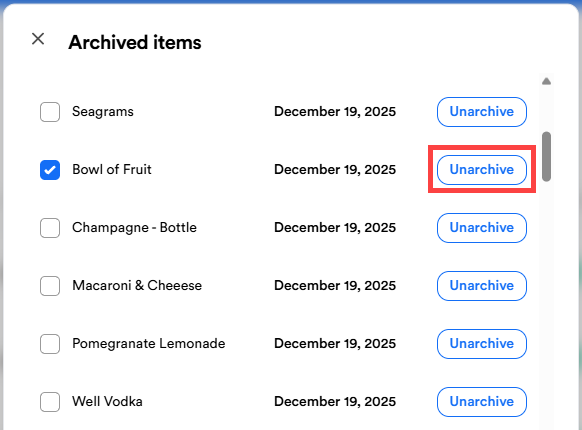 - Select the checkbox next to the item and select Unarchive to restore it.