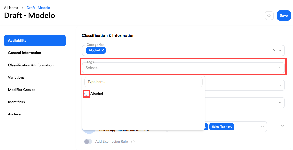 - Under Classification & Information, select the Tags dropdown and select Alcohol.