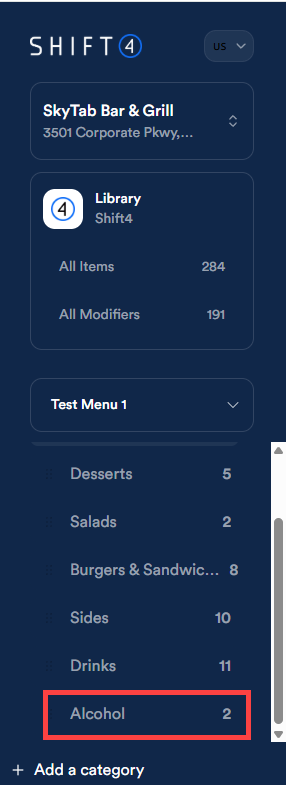 - On the Menu page, use the left side panel to select the alcohol category that includes the item you want to tag.