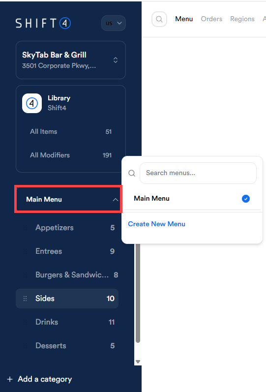 - Select the Menu dropdown in the left navigation bar. In this example, ours is called Main Menu.