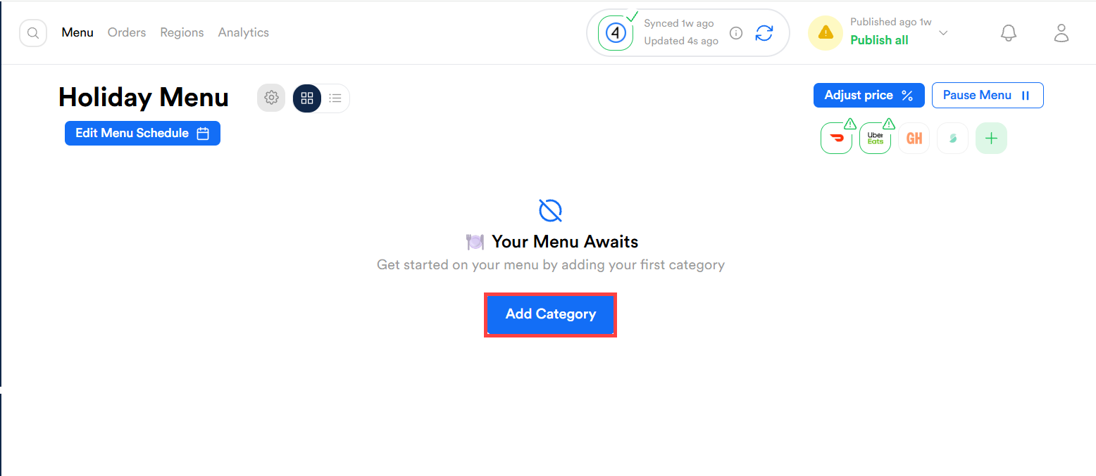 - Navigate to the new menu (e.g., Holiday Menu) and populate it with categories.