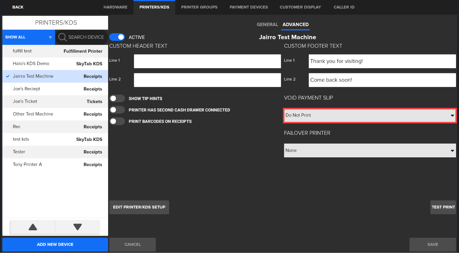 - Tap the Advanced tab and locate "Void Payment Slip."