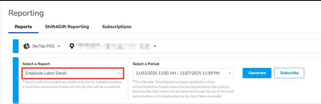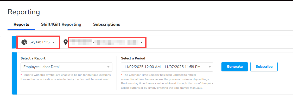- Select SkyTab POS and location(s) from the dropdowns. You can select multiple locations for this report.
