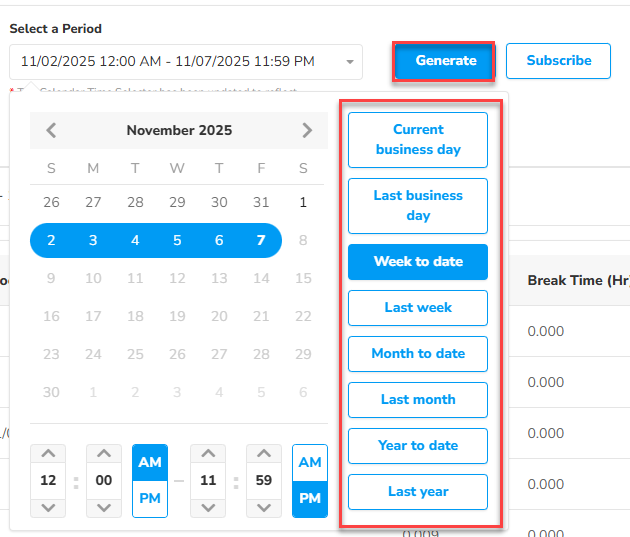 - Choose a date range and select Generate. The report includes all shifts that start within the specified range.