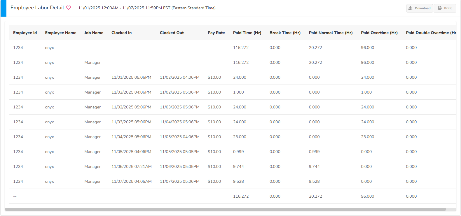 - Shows Paid Normal Time, Overtime, and Double Overtime per shift.