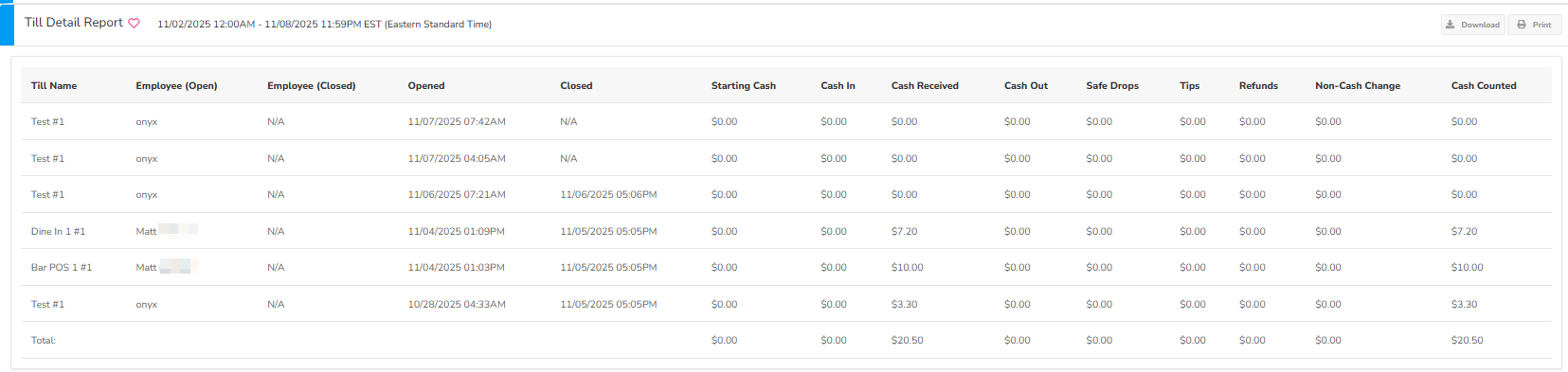 - Till Detail Report: Use when you need a complete record of all till openings and closings, including cash movements, tips, refunds, and non-cash changes. Good for end-of-day review.