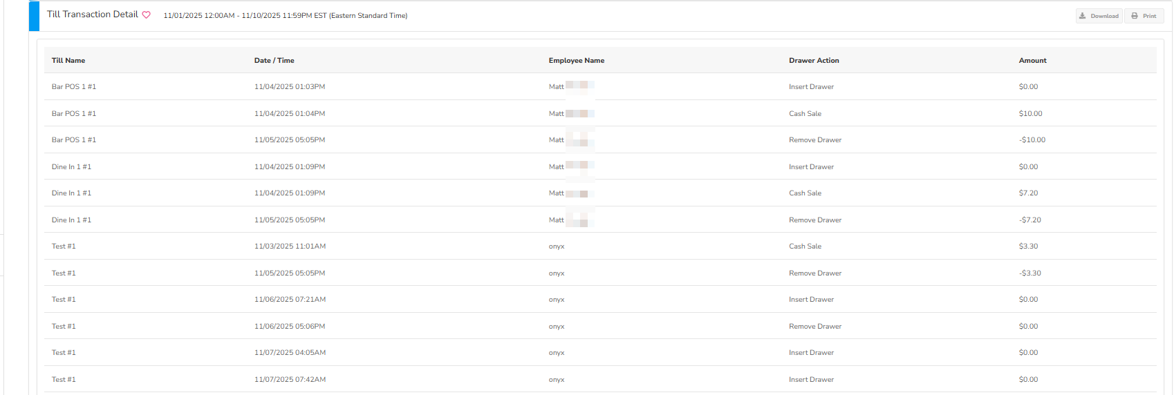 | Till Transaction Summary by Till | Transactions grouped by terminal name, drawer action, and date | By terminal name and drawer action | Till Name / Terminal, Drawer Action, Date/Time, Employee Name, Amount | Provides a summary view of cash moving in and out by terminal; multiple locations selectable; not for daily cash deposit balancing |