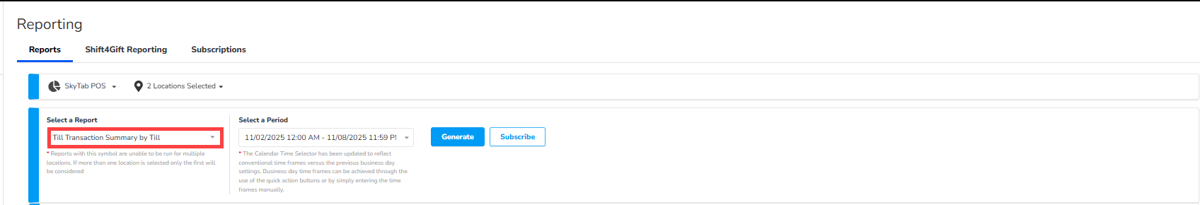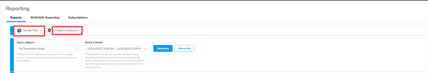 - Select SkyTab POS and location(s) from the dropdowns. You can select multiple locations for this report.