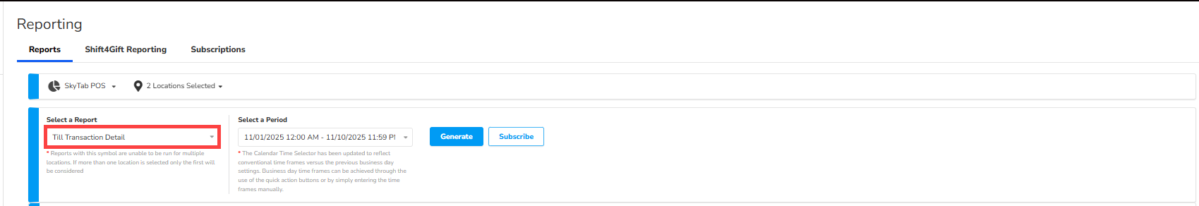 | Till Detail Report | Transactions grouped by till | Descending by till opened time | Includes who opened and closed the till, cash in/out, starting cash, safe drops, tips, refunds, non-cash changes, and cash counted | Shows detailed till activity; multiple locations selectable; not for daily cash deposit balancing |