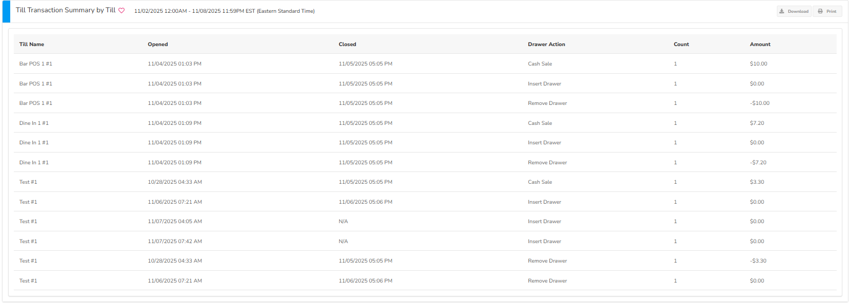 - Till Transaction Summary by Till Report: Use when you need a summarized view of cash activity by terminal and drawer action for a selected period. Helps monitor cash flow without reviewing individual transactions.