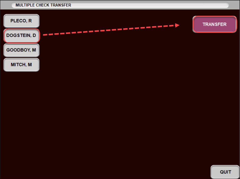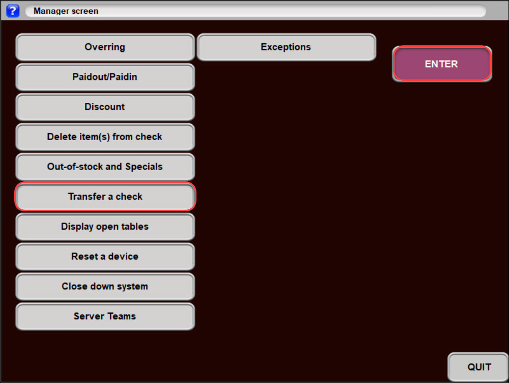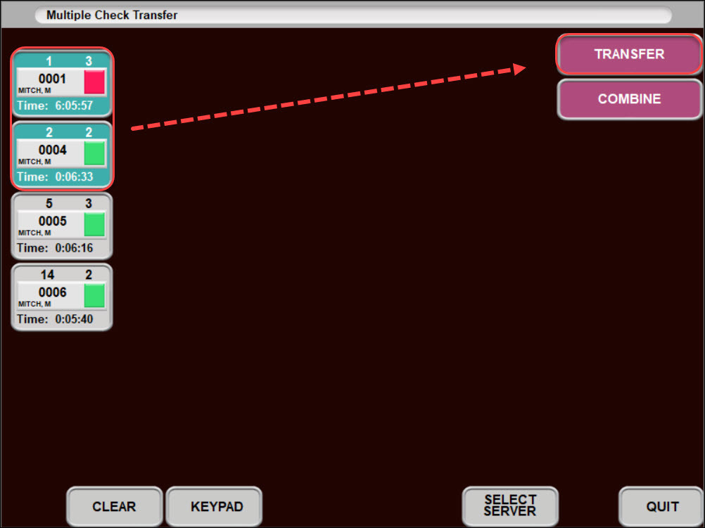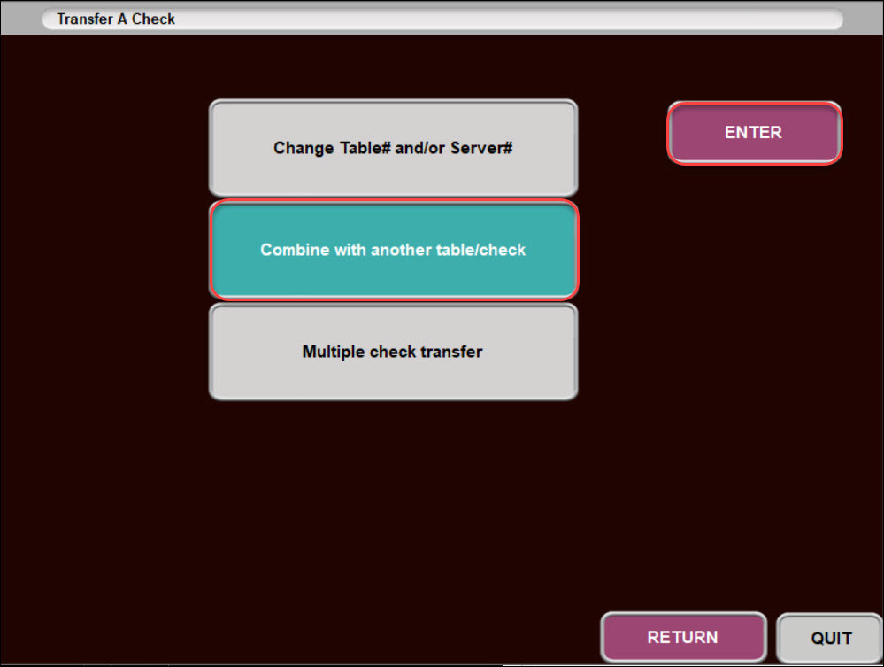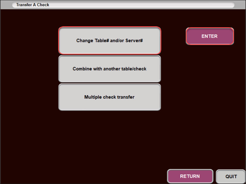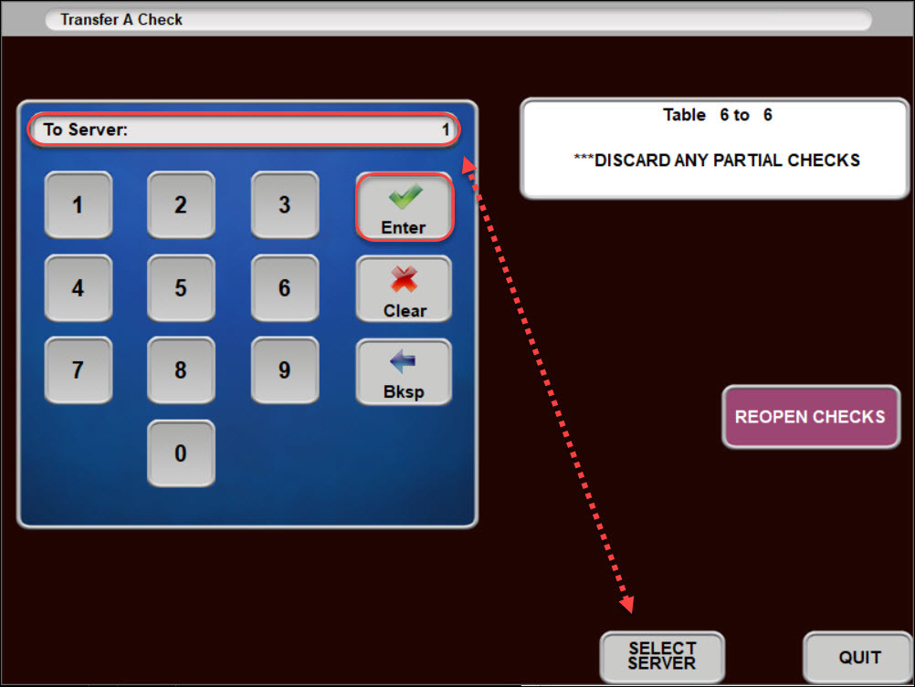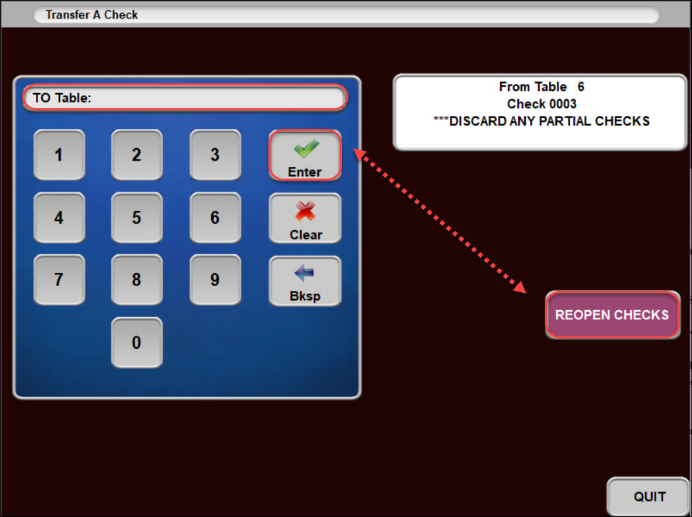 - Enter in the TO Table number and press Enter OR select REOPEN CHECKS, select from the list of checks, and press TRANSFER.