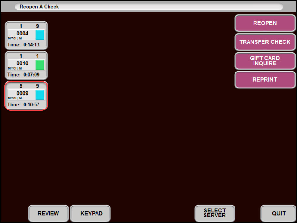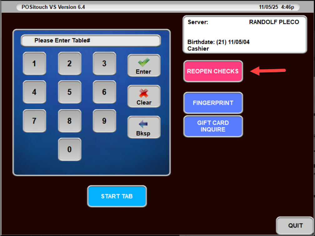 - Enter the table number and press ENTER, OR select REOPEN CHECKS and choose the check from a list.