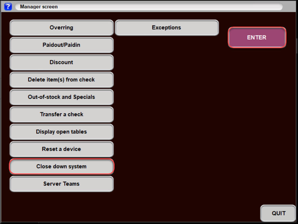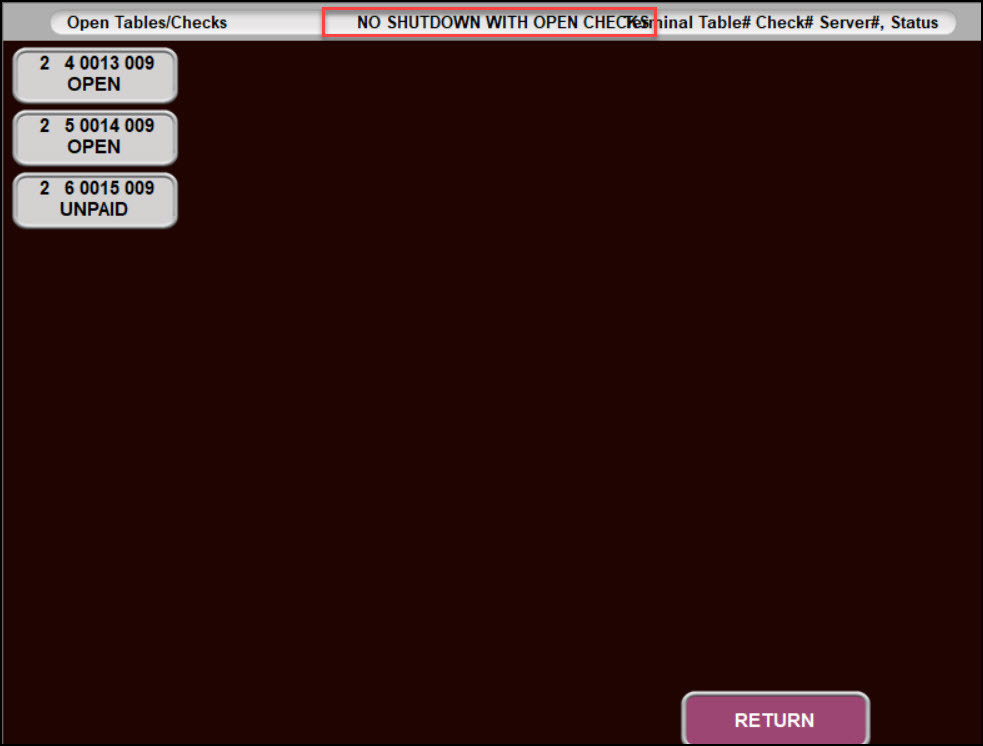 - The system will prevent manually shutting down the system if there are open or unpaid checks. You may notice a broadcast message “NO SHUTDOWN WITH OPEN CHECKS” if a shutdown is attempted with open checks remaining in the system.