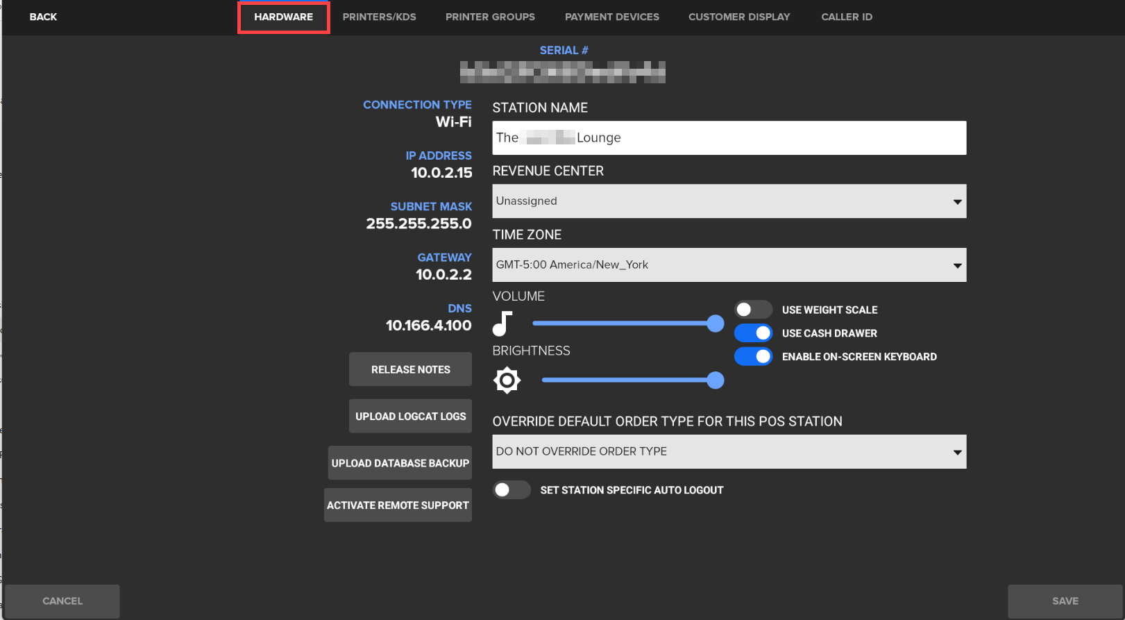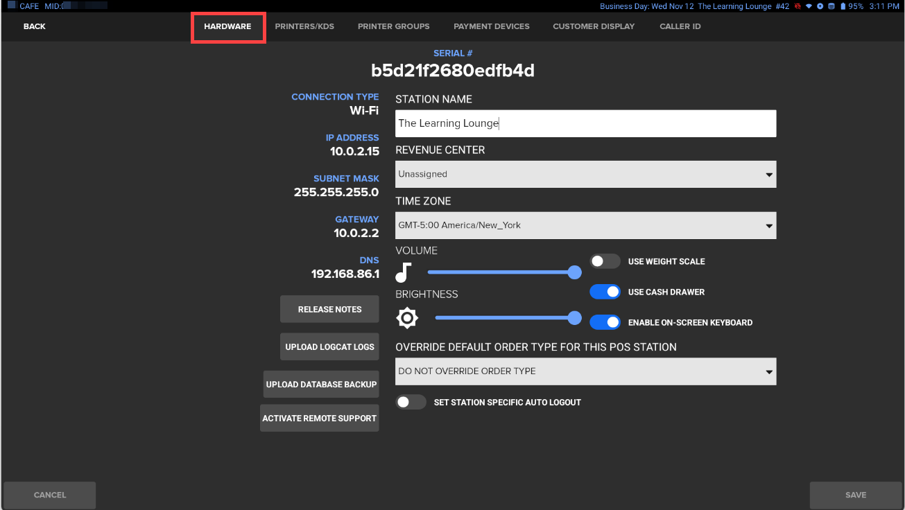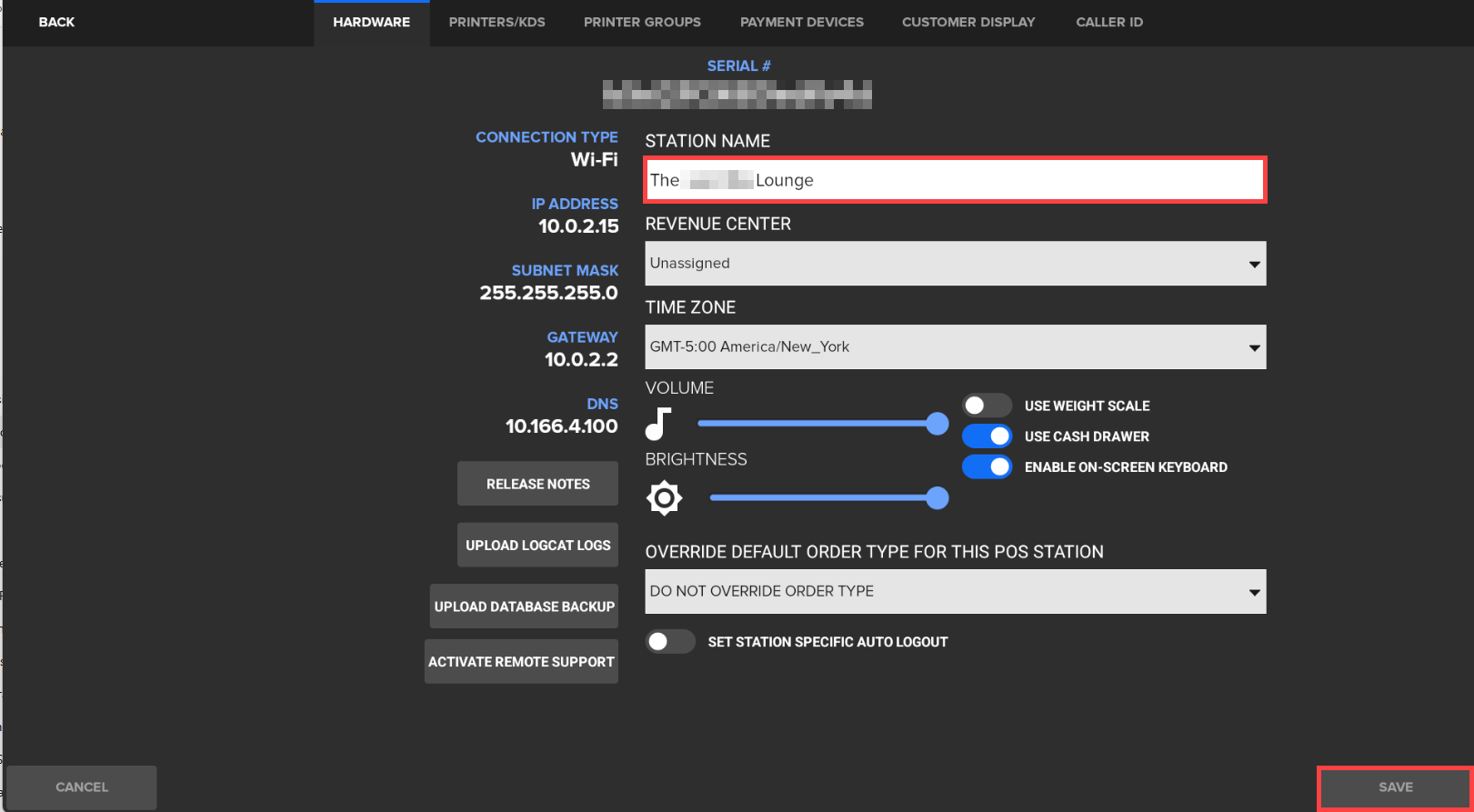 Note: This name appears in the upper-right corner of the POS screen and on system reports. - Tap Save to apply the change.