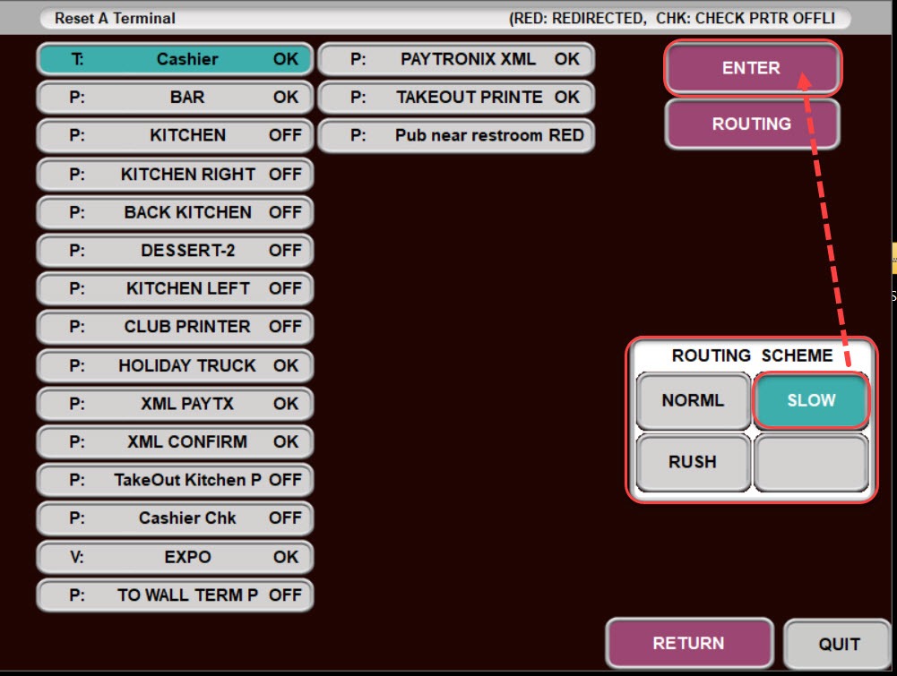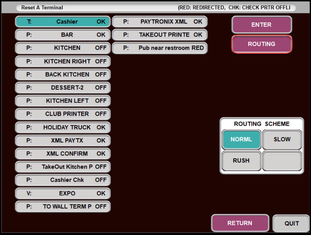 Description: Learn how to reset a terminal, printer, or kitchen video, select an alternate routing scheme, and change the routing by prep category from the front of the house terminal.