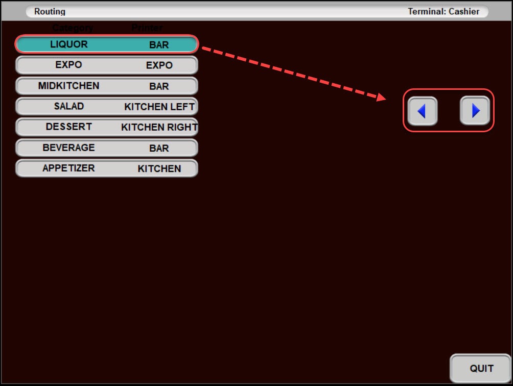 - Select a prep category and use the arrow keys to scroll through the available printers or kitchen videos, and choose the printer or kitchen video to which the prep category should be assigned.