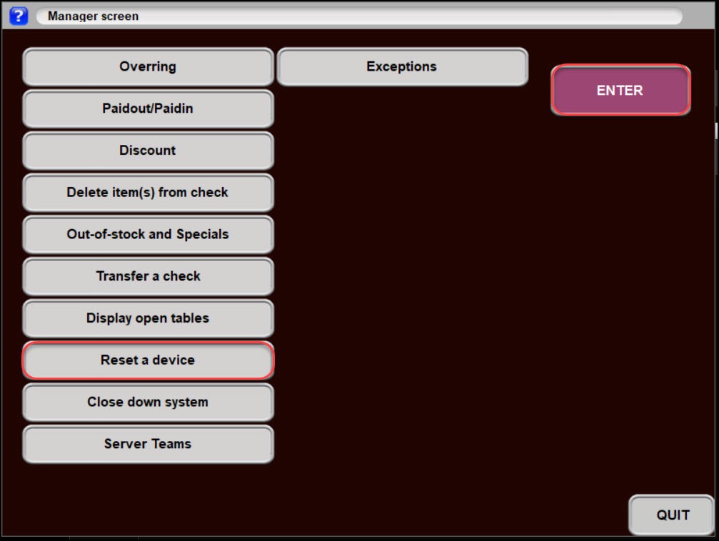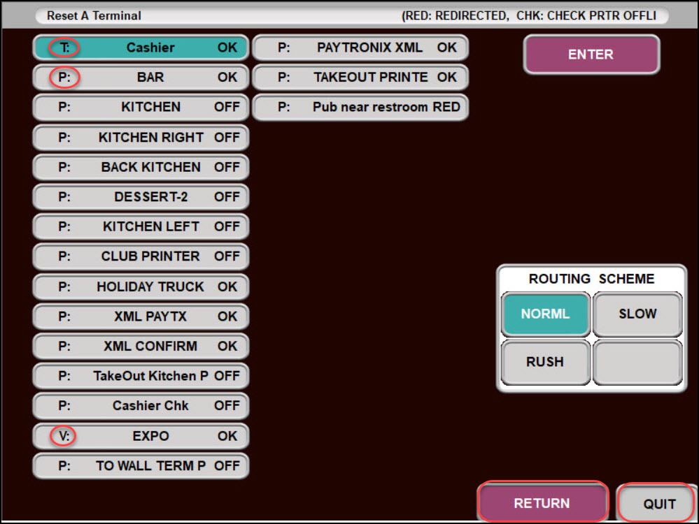 - Select the terminal (T:), printer (P:), or kitchen video display (V:) that you want to reset, then select Enter.