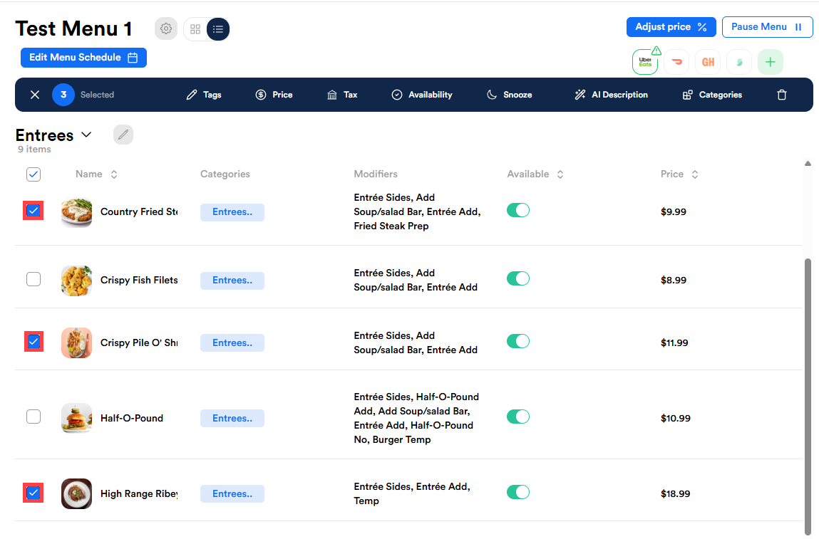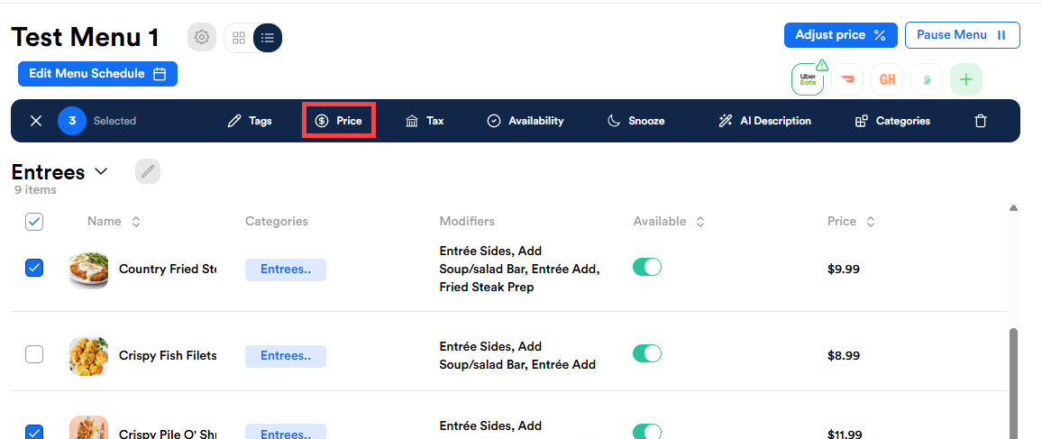 Description: Learn to quickly adjust prices on Shift4 Delivery for multiple items within a specific category using bulk editing. This process allows you to apply percentage or dollar-based increases across selected items and third-party channels efficiently.