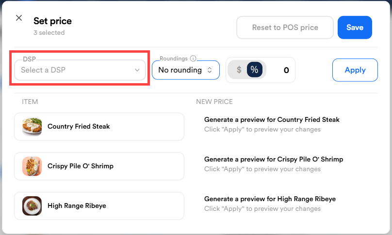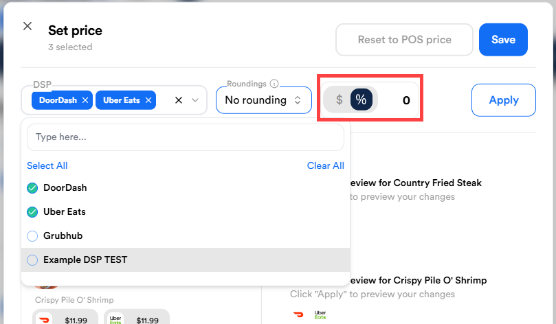 - Select % for a percentage increase or $ for a fixed dollar amount.