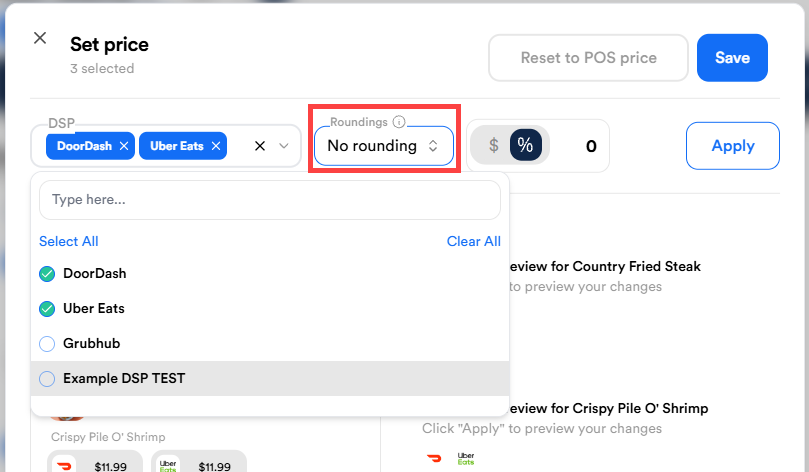 - Choose Rounding to round prices, or No Rounding to leave exact values.