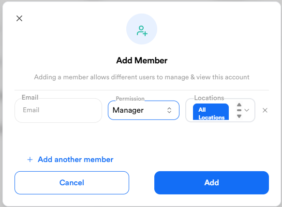 Note: Leaving locations unselected grants visibility into All Locations. - Select Add to save the new team member with their assigned permissions.