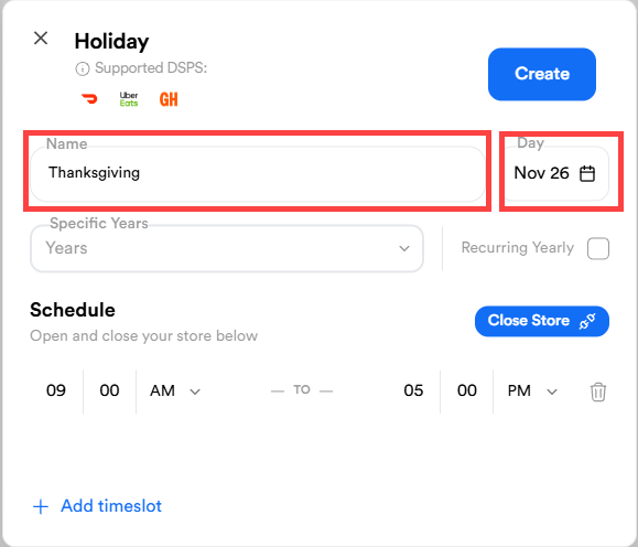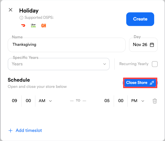 - Edit the Open/Close times for that date and select Create or select Close Store to remain closed the entire day.