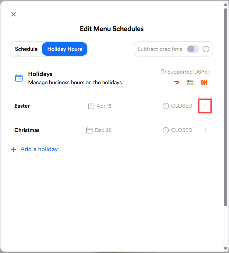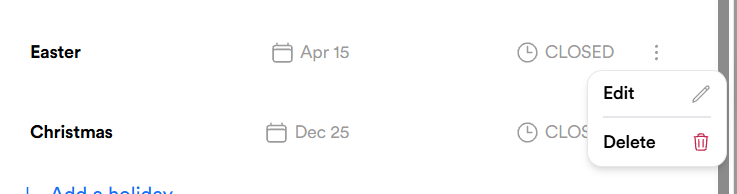 - Select the kebab (3 vertical dots) next to the holiday you want to edit/delete.