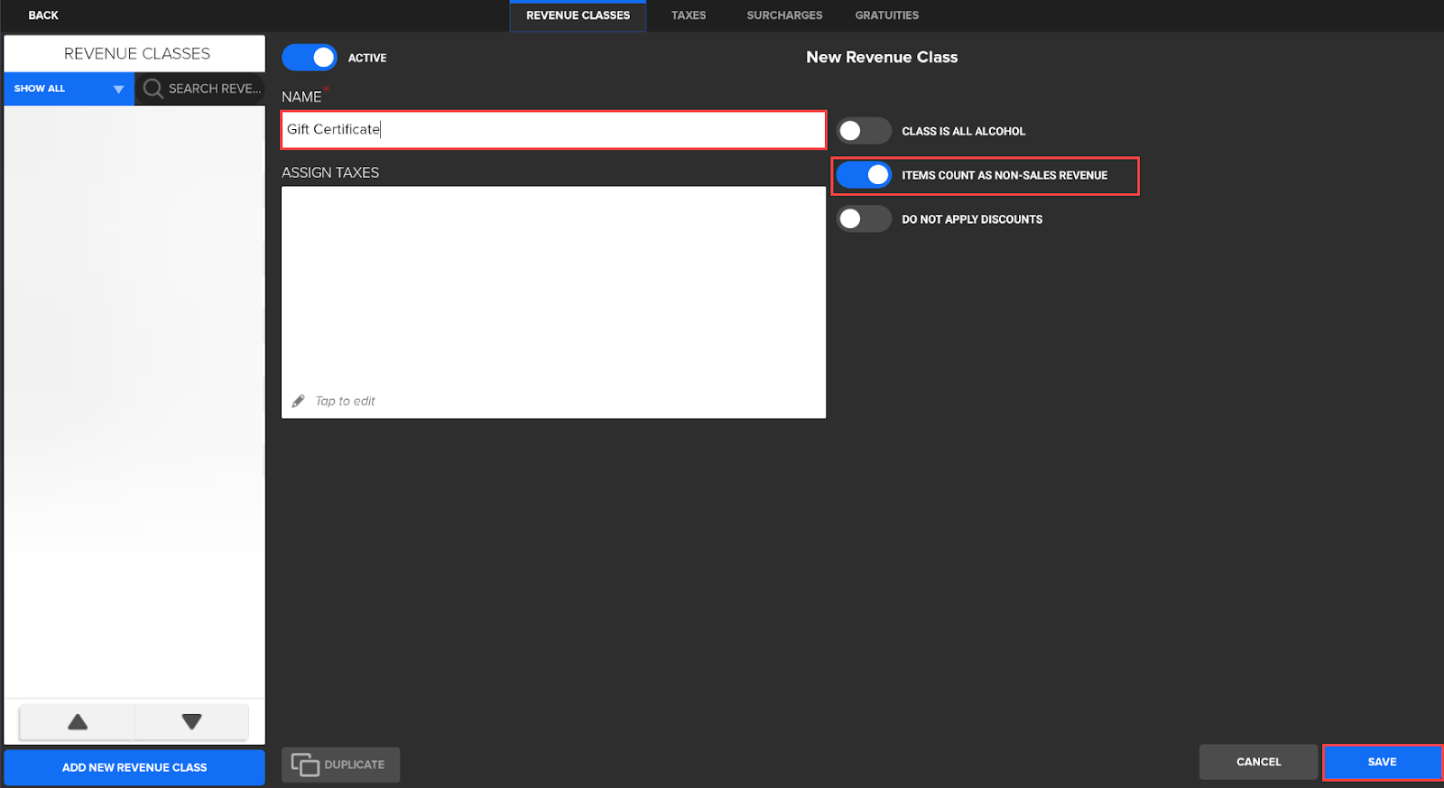 - Name the Revenue Class as Gift Certificate, enable the Item Count as Non-Sales Revenue toggle, and press the blue Save button at the bottom right corner of the POS Terminal screen.