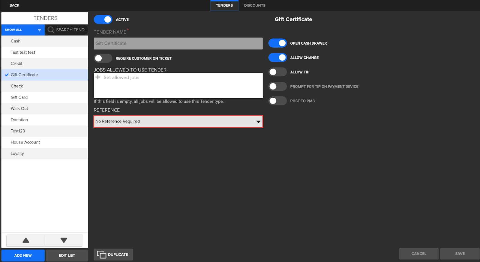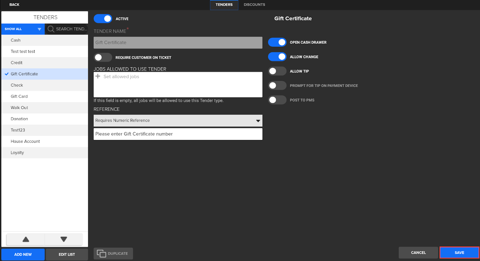 - Note: The Gift Certificate tender type should be configured by default, unless manually disabled. If the tender type is disabled, enable it by pressing the Active toggle.