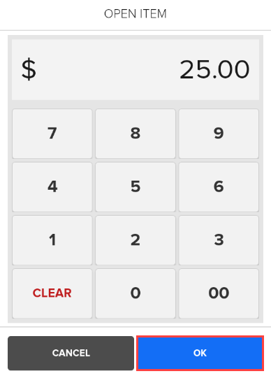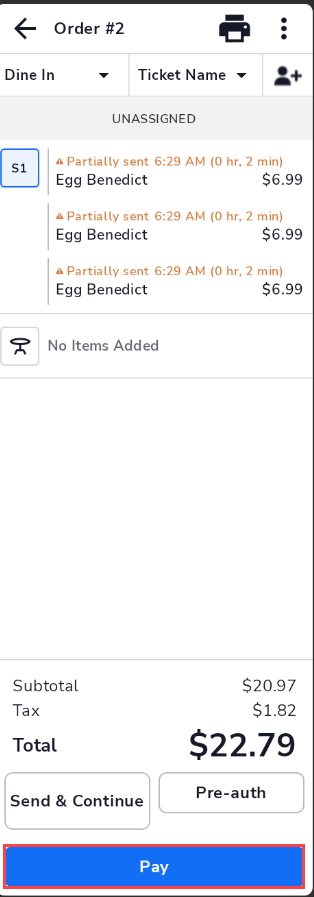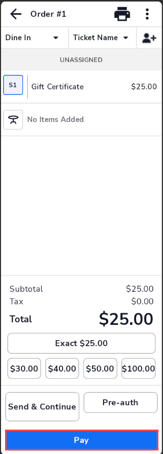 - Create the order by adding items to the ticket, then navigate to the payment screen by selecting the blue Pay button.