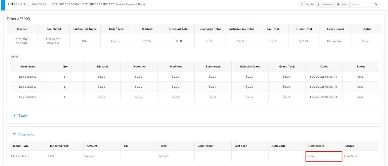 - The Gift Certificate Reference is displayed in the Reference # section as shown in the screenshot below.