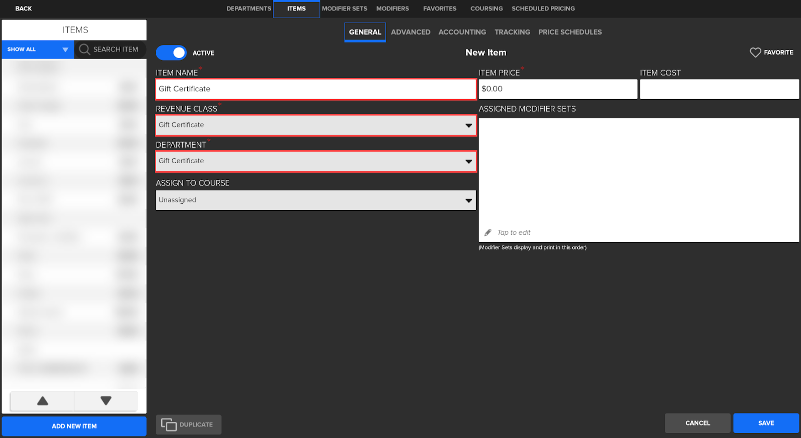 - Enter Item Name, select Revenue Class (Gift Certificate), and Department as shown below.