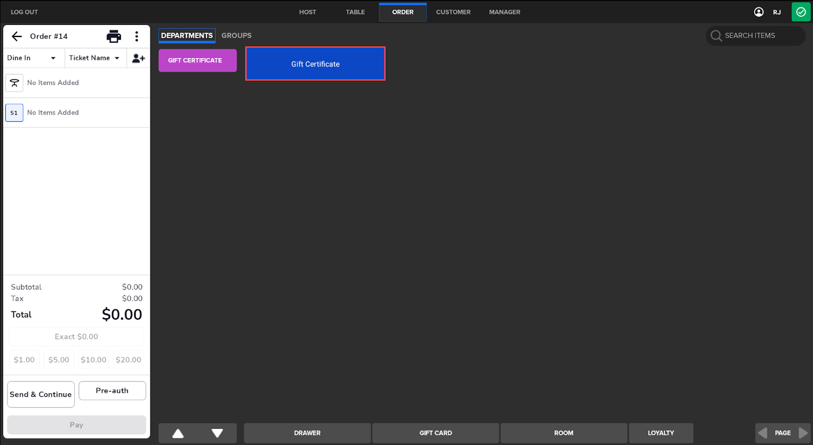 Note: In this example, the Gift Certificate department is shown as a separate department. However, the Gift Certificate item can be assigned to the departments based on personal preference. If a separate department needs to be created, as in this example, please visit the Create or Edit Departments on SkyTab POS article.