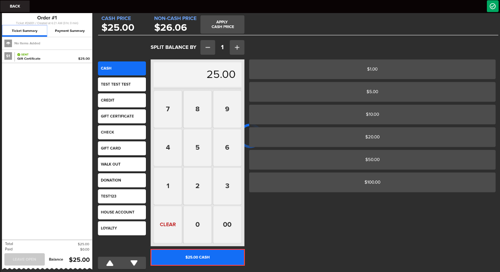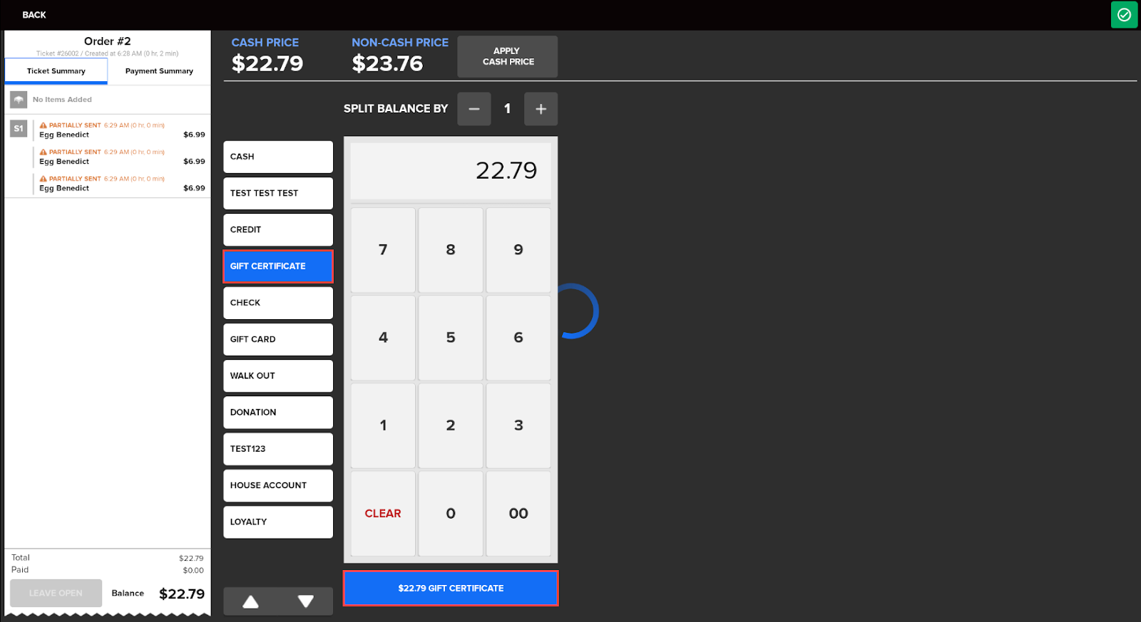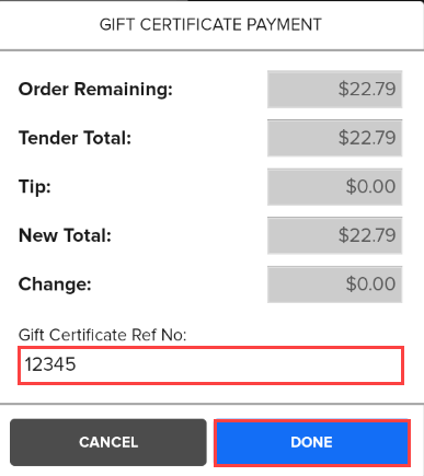 - Select the Gift Certificate tender type and press the blue button that displays the amount at the bottom of the POS Terminal screen.