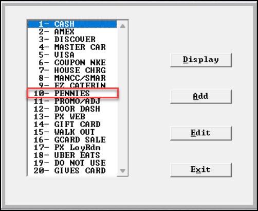 - Add a form of payment called "PENNIES". This will be an unused payment type that will not be displayed at the front of the house. This will be the account that accumulates the net rounding amount to ensure everything stays in balance.