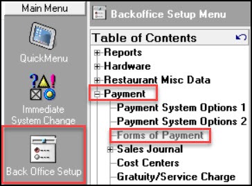 - From the Back Office Setup menu, select Payment > Forms of Payment.