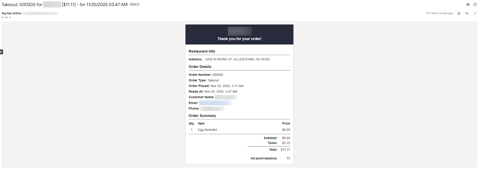 Once the SkyTab Online or QR Pay online order has been confirmed, the merchant will receive an email notification and/or SMS notification based on the SkyTab Online integration configuration. For more information, refer to the Set up Notifications/Alerts for Incoming Online Orders for SkyTab Online article. The example of a merchant email notification is shown in the screenshot below.