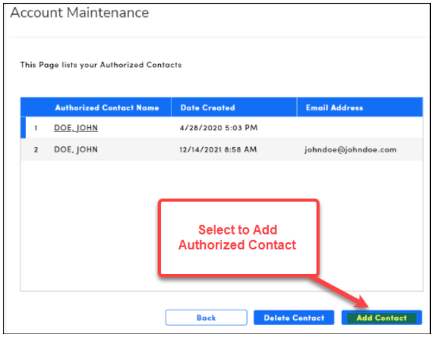 - Delete by selecting the contact name and clicking Delete Contact, or add by clicking on the Add Contact button.