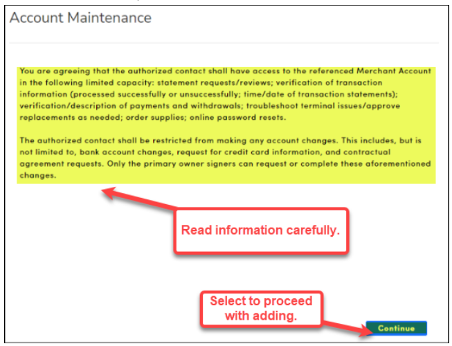 - If adding, read the confirmation page advising of the capabilities (and restrictions) of authorized contacts added, and then select Continue.