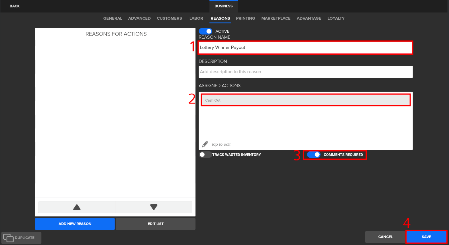 - Name the lottery winner payout reason with desired name (e.g., “Lottery Winner Payout”).
