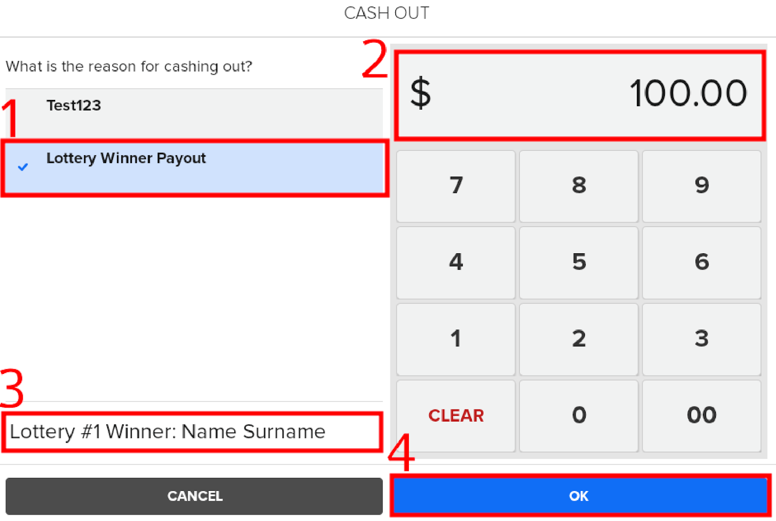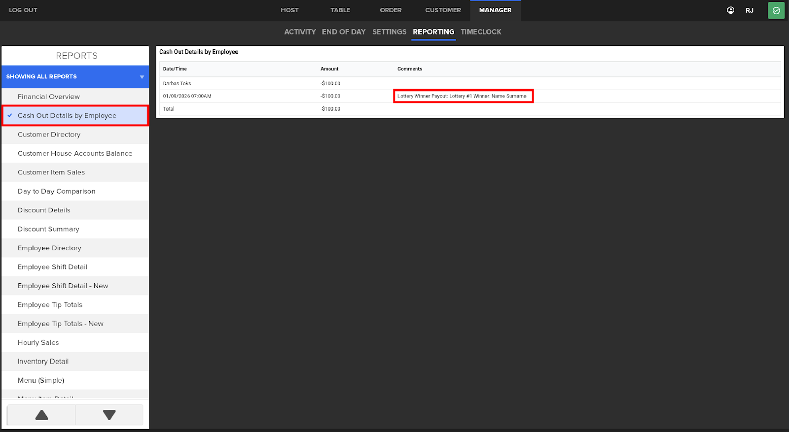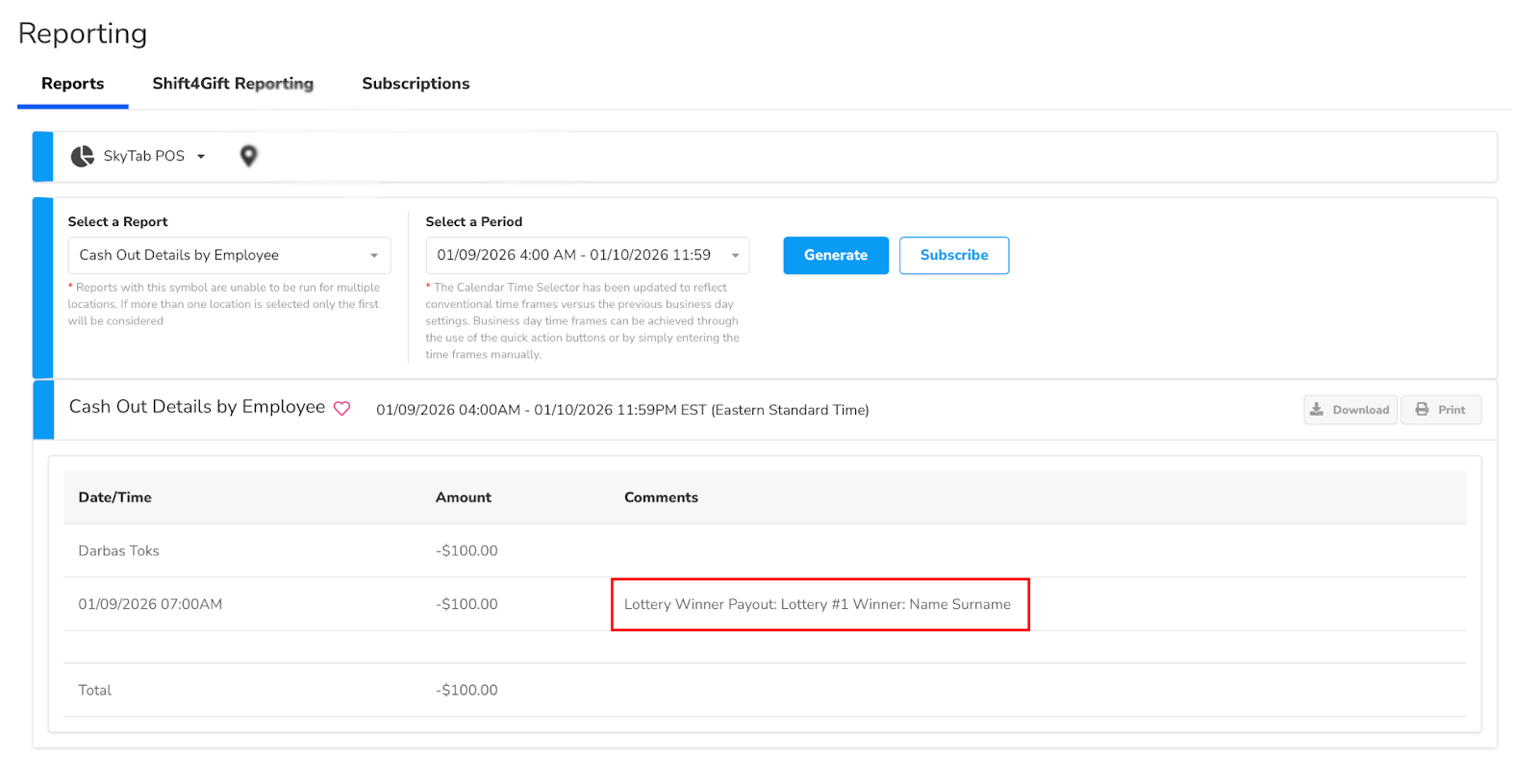 Lottery Payout cash out actions reflect on the reporting called Cash Out Details By Employee, which is available on both POS & LBM reporting. Required comment for the reason helps with locating the exact reason (in this case lottery winner) for the cash out action that has been completed. Additionally, it reflects employee name and cash out amount.
