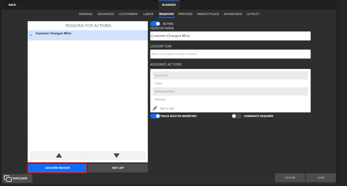 - Navigate to the Manager > Settings > Business > Reasons and select the blue Add Reason button.