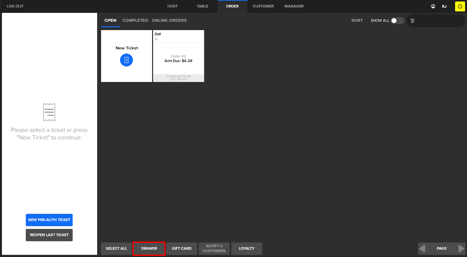 - Navigate to the Order screen and press the Drawer button located in the bottom middle of the screen.