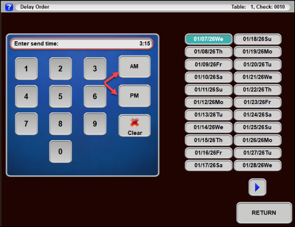 - Use the keypad to type in the time the order will send and select AM or PM.