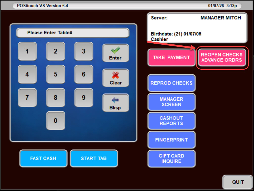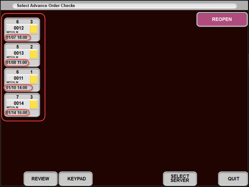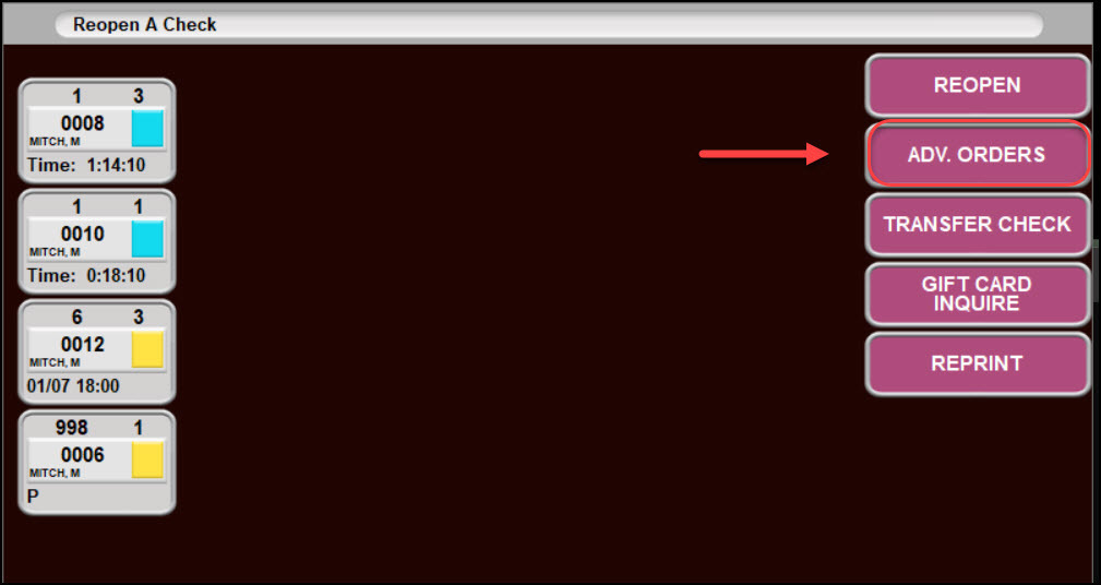 - When a server has advance orders, the REOPEN CHECKS button will also display “ADVANCE ORDRS.”