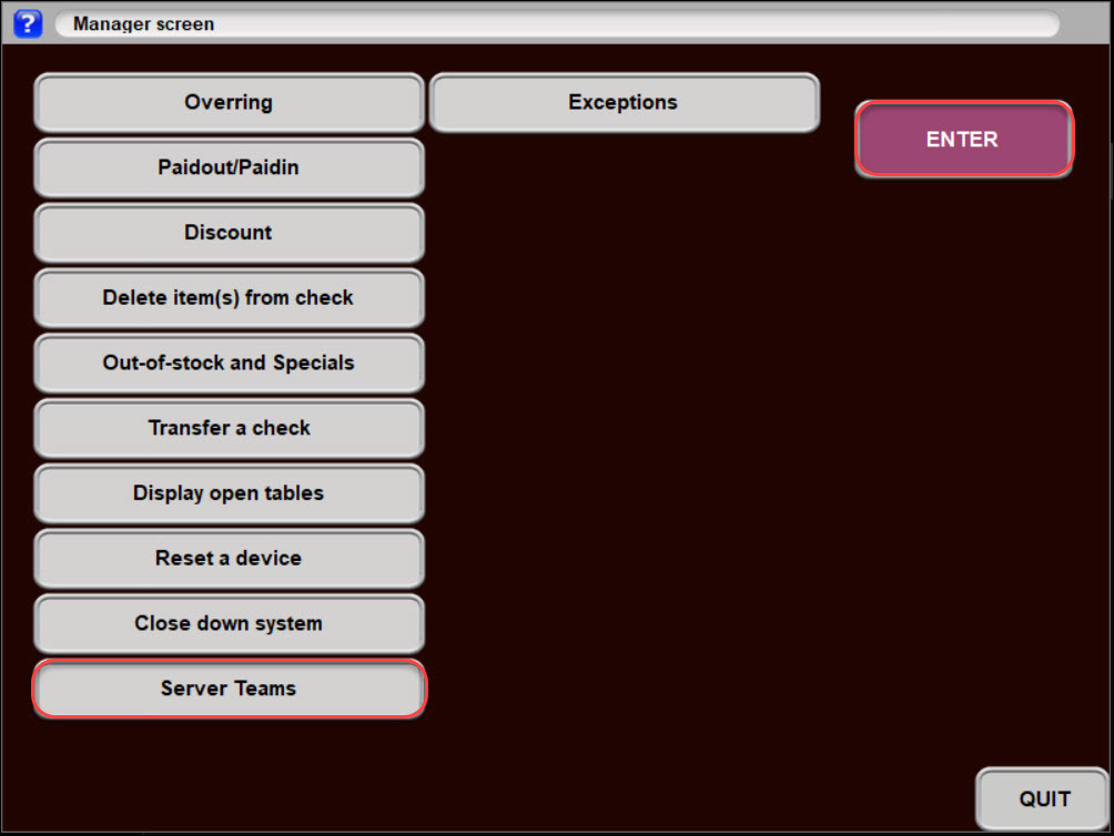 - From the Manager Screen, go to Server Teams and press NEXT TEAM to scroll through any teams that have been set up.