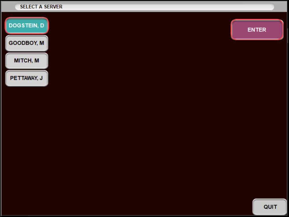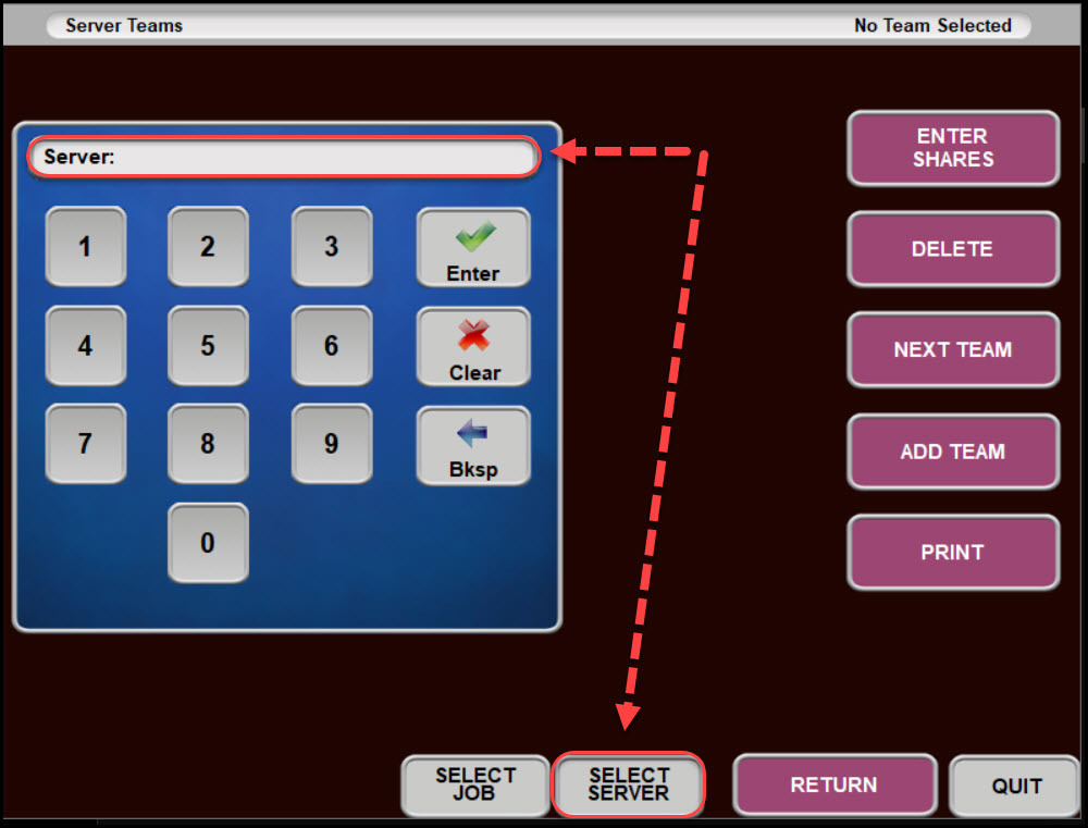 - Enter the server number of the team member and press Enter OR press SELECT SERVER (example below) to select team members from a list and press Enter.