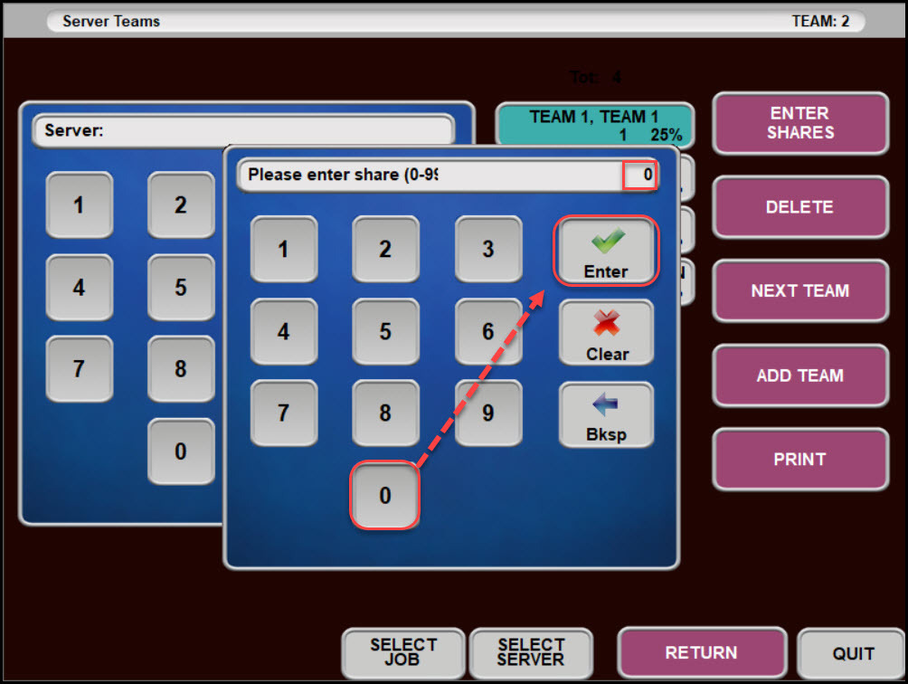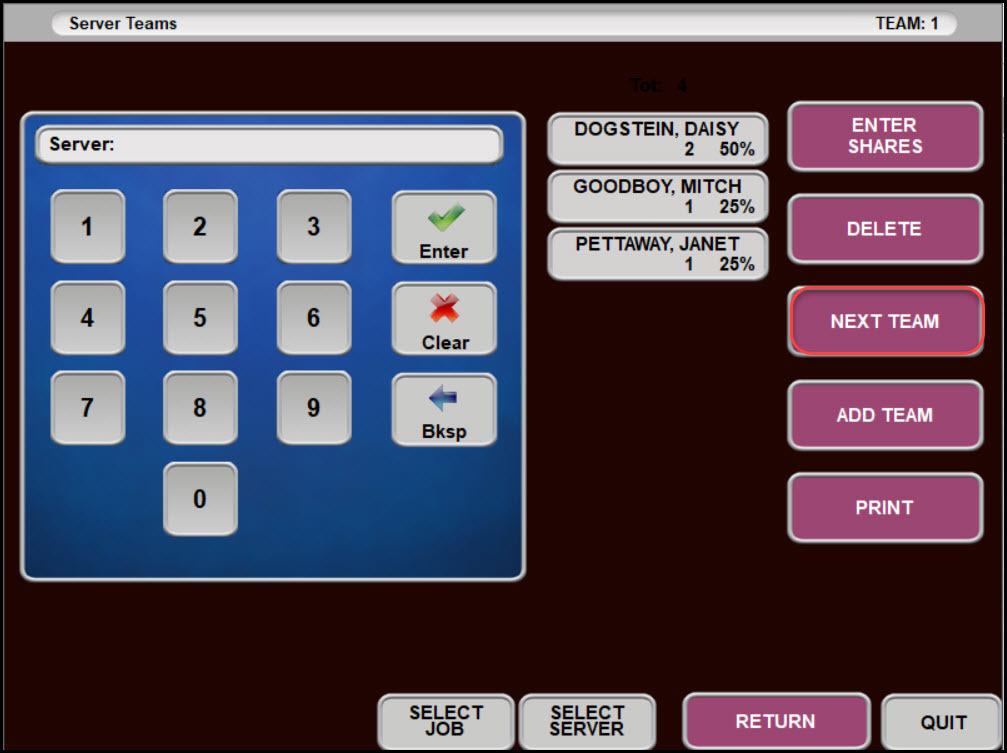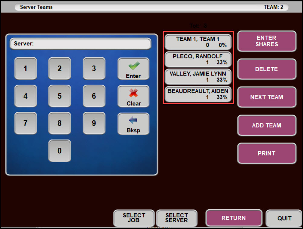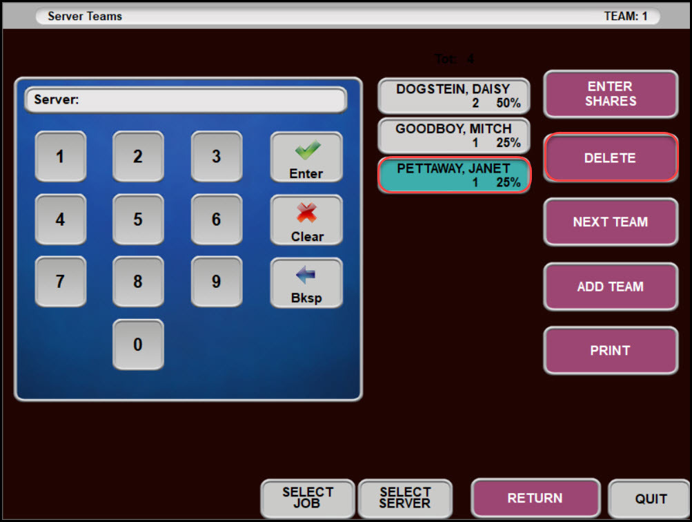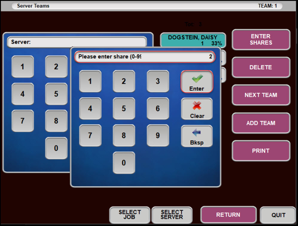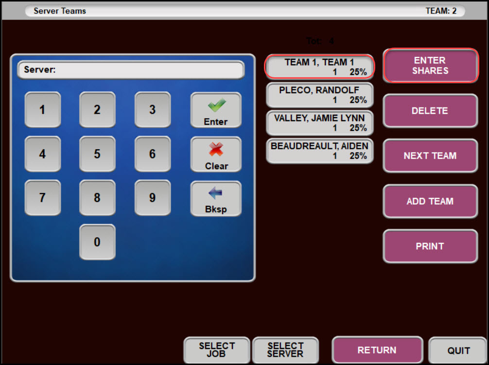 Important: This step will ensure that the Team 1 user does not share in the sales and tips of the team. - The shares will now be set equally between the remaining team members. The shares of the remaining team members can be changed by pressing the name and pressing ENTER SHARES. When done, press RETURN .