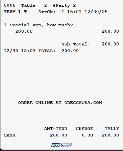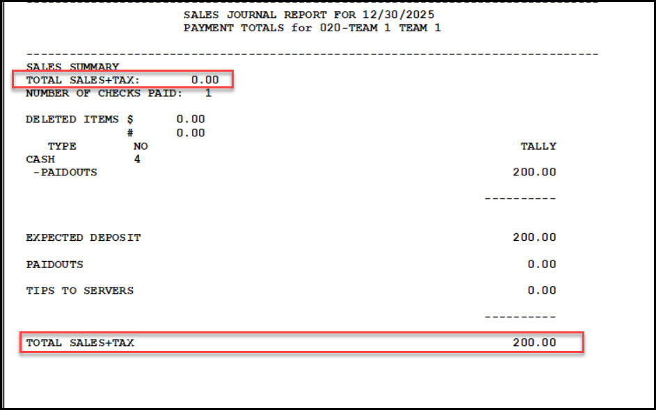 - A cashout of Team 1 shows 0 for total sales + tax under the sales summary (since Team 1 user had zero shares), but an amount of $200.00 under payment since Team 1 closed the check.